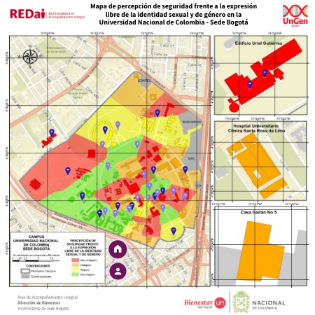 Este mapa de calor está basado en una encuesta realizada a cerca de 1000 estudiantes en el 2020-1. En este se puede apreciar su percepción respecto a zonas seguras e inseguras para expresar su orientación sexual o su identidad de género en la Universidad Nacional de Colombia. sede Bogotá.