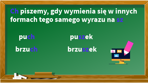 Ch piszemy, gdy wymienia się w innych formach tego samego wyrazu na sz