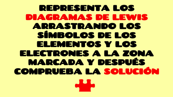 REPRESENTA LOS DIAGRAMAS DE LEWIS ARRASTRANDO LOS SÍMBOLOS DE LOS ELEMENTOS Y LOS ELECTRONES A LA ZONA MARCADA Y DESPUÉS COMPRUEBA LA SOLUCIÓN