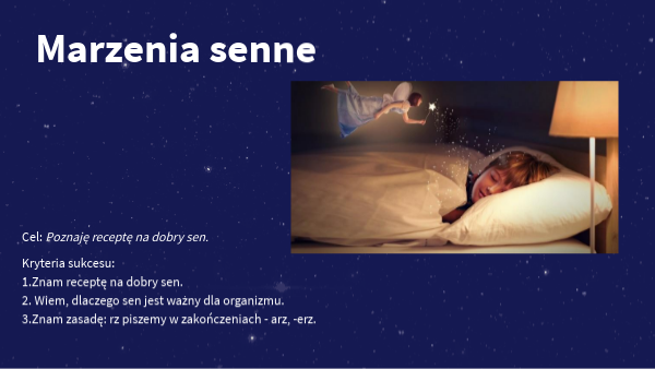 Kryteria sukcesu:1.Znam receptę na dobry sen. 2. Wiem, dlaczego sen jest ważny dla organizmu. 3.Znam zasadę: rz piszemy w zakończeniach - arz, -erz.