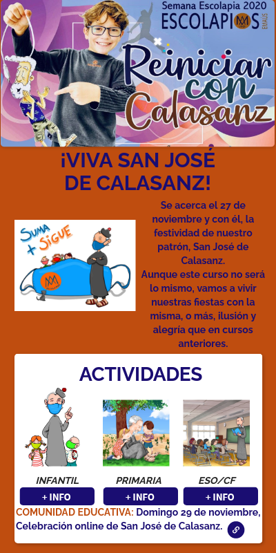 Se acerca el 27 de noviembre y con él, la festividad de nuestro patrón, San José de Calasanz.Aunque este curso no será lo mismo, vamos a vivir nuestras fiestas con la misma, o más, ilusión y alegría que en cursos anteriores.