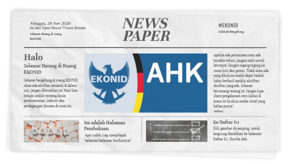 Selamat bergabung di ruang EKONID. Akan ada aktifitas menarik di dalam sini, jangan dilewatkan ya! Mari kita belajar sedikit tentang dunia perekonomian, industri dan perdagangan Jerman di room ini.