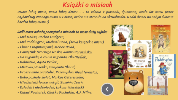 Dzieci lubią misie, misie lubią dzieci... - to zdanie z piosenki, śpiewanej wiele lat temu przez najbardziej znanego misia w Polsce, które nie straciło na aktualności. Nadal dzieci na całym świecie bardzo lubią misie :)Jeśli masz ochotę poczytać o misiach to masz duży wybór: - Miś Maksa, Barbro Lindgren, - Miś Paddington, Michael Bond, (seria książek o misiu) - Elmer i zaginiony miś, Mckee David, - Pamiętnik Czarnego Noska, Janina Porazińska, - Co wypanda, a co nie wypanda, Ola Cieślak, - Robimisie, Agata Królak, - Misiowa piosenka, Benjamin Chaud, - Proszę mnie przytulić, Przemysław Wechterowicz, - Bobo poznaje świat, Markus Osterwalder, - Niedźwiedź łowca motyli, Susanna Isern, - Dziadek i niedźwiadek, Łukasz Wierzbicki, - Kubuś Puchatek, Chatka Puchatka, A.A.Milne.