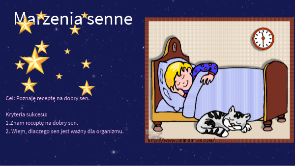 Kryteria sukcesu:1.Znam receptę na dobry sen.2. Wiem, dlaczego sen jest ważny dla organizmu.