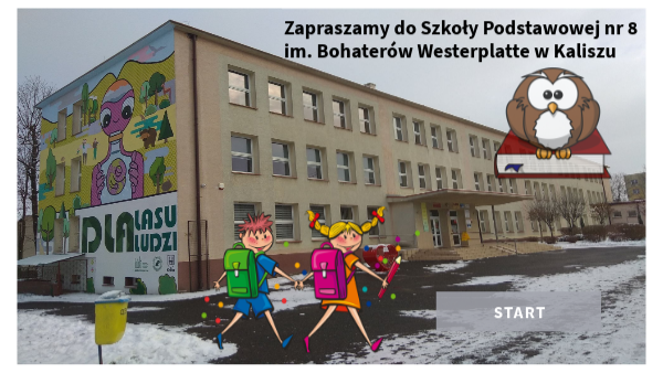 Zapraszamy na wirtualny spacer - grę po Szkole Podstawowej nr 8 w Kaliszu. Zwiedzając budynek, znajdziesz proste pytania na temat naszej podstawówki. Podczas spaceru zanotuj litery, które pojawią się po udzieleniu poprawnych odpowiedzi. Sprawdzaj interaktywne przyciski, które pomogą Ci ukończyć grę. Powodzenia!