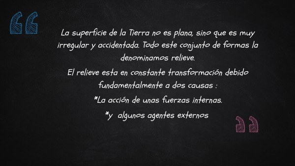 La superficie de la Tierra no es plana, sino que es muy irregular y accidentada. Todo este conjunto de formas la denominamos relieve. El relieve esta en constante transformación debido fundamentalmente a dos causas : *La acción de unas fuerzas internas. *y algunos agentes externos