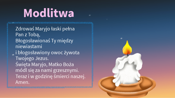 Zdrowaś Maryjo łaski pełna Pan z Tobą, Błogosławionaś Ty między niewiastami i błogosławiony owoc żywota Twojego Jezus. Święta Maryjo, Matko Boża módl się za nami grzesznymi. Teraz i w godzinę śmierci naszej. Amen.