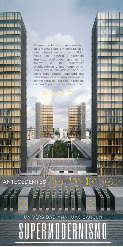 El supermodernismo se manifiesta en la transparencia y ligereza, en el minimalismo, en una sensibilidad hacia lo neutral, indefinido, implícito, cualidades que no se limitan a la substancia arquitectónica y que terminan en una nueva sensibilidad espacial, un vacio bajo control, cualidad que caracteriza al supermodernimso, el control total del espacio indefinido, contenido por un cascarón flexible.