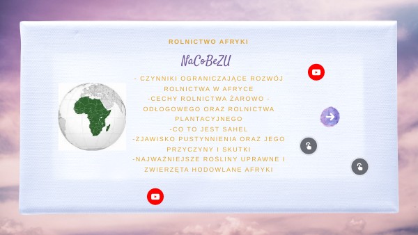 - czynniki ograniczające rozwój rolnictwa w Afryce-cechy rolnictwa żarowo - odłogowego oraz rolnictwa plantacyjnego -co to jest sahel -zjawisko pustynnienia oraz jego przyczyny i skutki -najważniejsze rośliny uprawne i zwierzęta hodowlane afryki