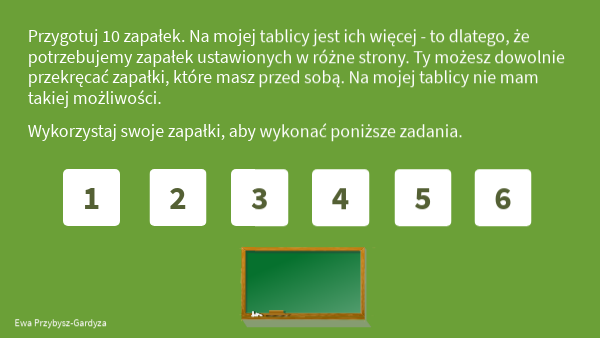Przygotuj 10 zapałek. Na mojej tablicy jest ich więcej - to dlatego, że potrzebujemy zapałek ustawionych w różne strony. Ty możesz dowolnie przekręcać zapałki, które masz przed sobą. Na mojej tablicy nie mam takiej możliwości.