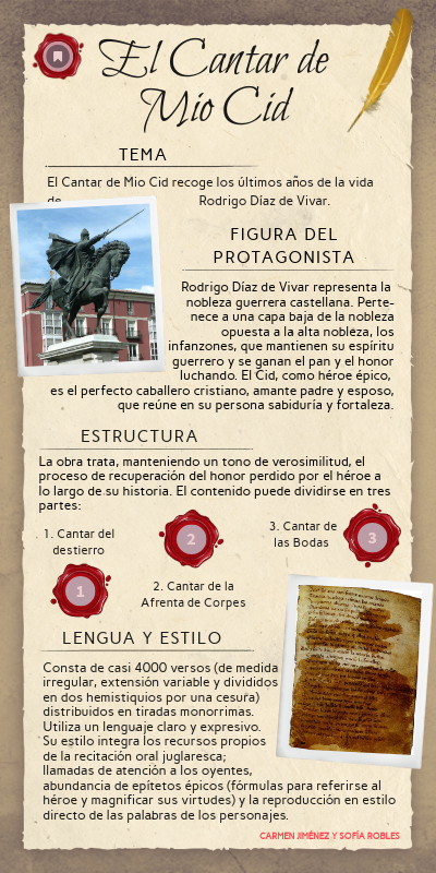 Rodrigo Díaz de Vivar representa la nobleza guerrera castellana. Perte- nece a una capa baja de la nobleza opuesta a la alta nobleza, los infanzones, que mantienen su espíritu guerrero y se ganan el pan y el honor luchando. El Cid, como héroe épico, es el perfecto caballero cristiano, amante padre y esposo, que reúne en su persona sabiduría y fortaleza.