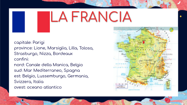 capitale: Parigiprovince: Lione, Marsiglia, Lilla, Tolosa, Strasburgo, Nizza, Bordeaux confini: nord: Canale della Manica, Belgio sud: Mar Mediterraneo, Spagna est: Belgio, Lussemburgo, Germania, Svizzera, Italia ovest: oceano atlantico