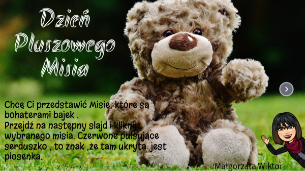 Chcę Ci przedstawić Misie, które są bohaterami bajek . Przejdź na następny slajd i kliknij wybranego misia. Czerwone pulsujące serduszko , to znak ,że tam ukryta jest piosenka.