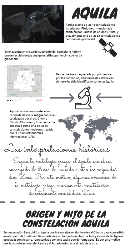 Según la mitología griega, el águila era el ser encargado de llevar de un lado a otro los rayos del dios Zeus. Por este motivo, algunas versiones de la mitología griega asocian esta constelación directamente con el dios Zeus.
