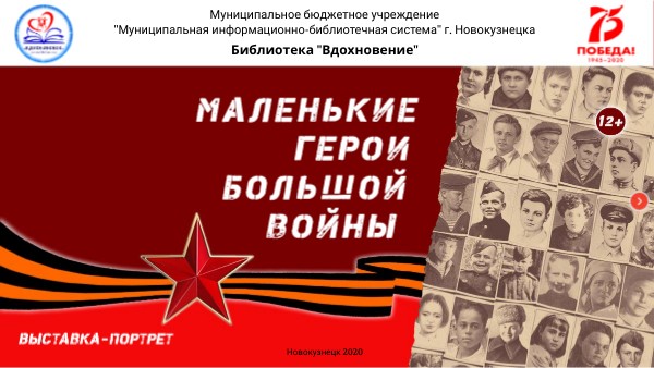 Маленькие герои большой войны : выставка-портрет : 12+ / [авт.-сост., оформ. Н. А. Теленкова] ; МБУ "Муниципальная информационно-библиотечная система" г. Новокузнецка, Библиотека "Вдохновение". – Новокузнецк, 2020. – Текст. Изображение : электронные // МБУ «МИБС» г. Новокузнецка : [сайт]. – Раздел сайта «Для детей и не только...», подраздел «Виртуальные выставки и буктрейлеры для детей». – Использован облачный сервис Genial.ly. – URL: https://view.genial.ly/5fbe50ac64645c12d135d820 (дата обращения: 08.02.2021).
