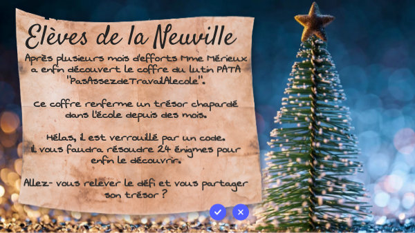 Après plusieurs mois d'efforts Mme Mérieux a enfin découvert le coffre du lutin PATA "PasAssezdeTravailAlecole".Ce coffre renferme un trésor chapardé dans l'école depuis des mois. Hélas, il est verrouillé par un code. Il vous faudra résoudre 24 énigmes pour enfin le découvrir. Allez- vous relever le défi et vous partager son trésor ?