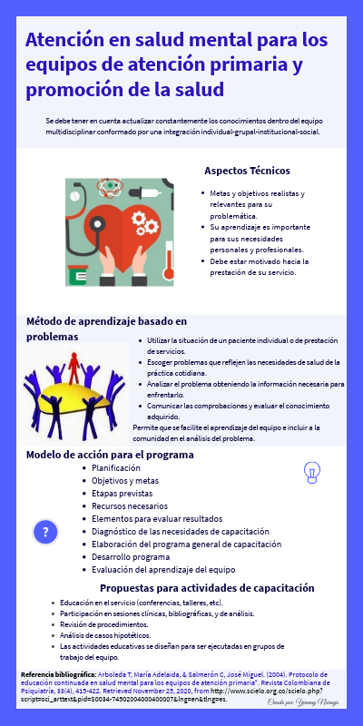 Referencia bibliográfica: Arboleda T, María Adelaida, & Salmerón C, José Miguel. (2004). Protocolo de educación continuada en salud mental para los equipos de atención primaria*. Revista Colombiana de Psiquiatría, 33(4), 415-422. Retrieved November 25, 2020, from http://www.scielo.org.co/scielo.php?script=sci_arttext&pid=S0034-74502004000400007&lng=en&tlng=es.