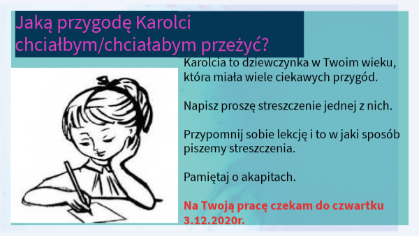 Karolcia to dziewczynka w Twoim wieku, która miała wiele ciekawych przygód. Napisz proszę streszczenie jednej z nich. Przypomnij sobie lekcję i to w jaki sposób piszemy streszczenia. Pamiętaj o akapitach. Na Twoją pracę czekam do czwartku 3.12.2020r.