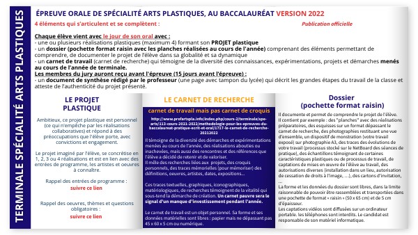 4 éléments qui s’articulent et se complètent :Chaque élève vient avec le jour de son oral avec :- une ou plusieurs réalisations plastiques (maximum 4) formant son PROJET plastique - un dossier (pochette format raisin avec les planches réalisées au cours de l'année) comprenant des éléments permettant de comprendre, de documenter le projet de l’élève dans sa globalité et sa dynamique - un carnet de travail (carnet de recherche) qui témoigne de la diversité des connaissances, expérimentations, projets et démarches menés au cours de l’année de terminale. Les membres du jury auront reçu avant l'épreuve (15 jours avant l’épreuve) : - un document de synthèse rédigé par le professeur (une page avec tampon du lycée) qui décrit les grandes étapes du travail de la classe et atteste de l’authenticité du projet présenté.