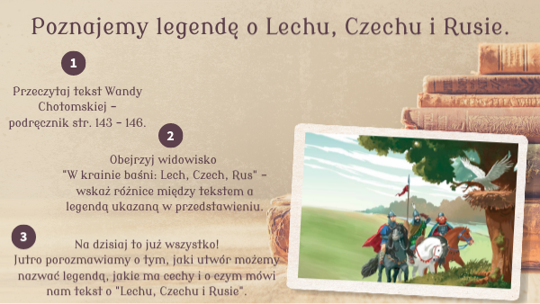 Na dzisiaj to już wszystko!Jutro porozmawiamy o tym, jaki utwór możemy nazwać legendą, jakie ma cechy i o czym mówi nam tekst o "Lechu, Czechu i Rusie".
