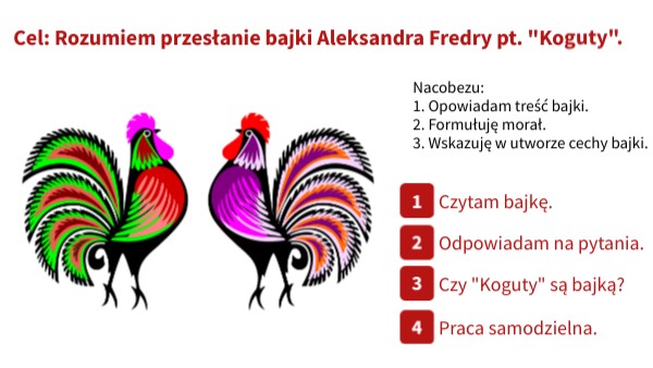 Cel: Rozumiem przesłanie bajki Aleksandra Fredry pt. "Koguty".