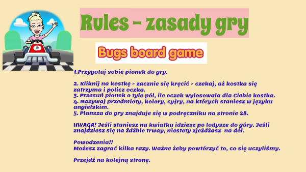 1.Przygotuj sobie pionek do gry. 2. Kliknij na kostkę - zacznie się kręcić - czekaj, aż kostka się zatrzyma i policz oczka. 3. Przesuń pionek o tyle pól, ile oczek wylosowała dla Ciebie kostka. 4. Nazywaj przedmioty, kolory, cyfry, na których staniesz w języku angielskim. 5. Plansza do gry znajduje się w podręczniku na stronie 28. UWAGA! Jeśli staniesz na kwiatku idziesz po łodysze do góry. Jeśli znajdziesz się na źdźble trway, niestety zjeżdżasz na dół. Powodzenia!! Możesz zagrać kilka razy. Ważne żeby powtórzyć to, co się uczyliśmy. Przejdź na kolejną stronę.