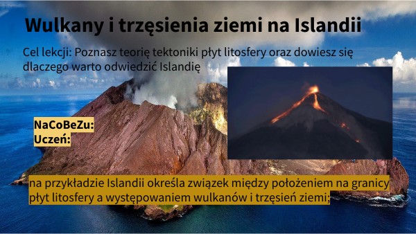 - na przykładzie Islandii określa związek między położeniem na granicy płyt litosfery a występowaniem wulkanów i trzęsień ziemi;