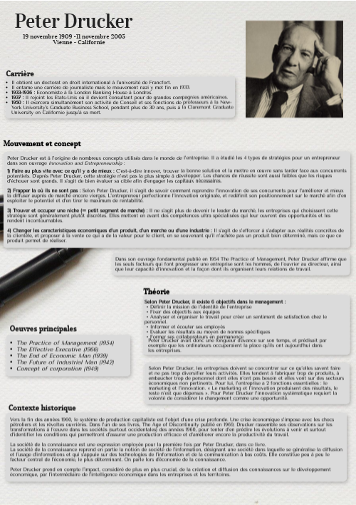 Dans son ouvrage fondamental publié en 1954 The Practice of Management, Peter Drucker affirme que les seuls facteurs qui font progresser une entreprise sont les hommes, de l’ouvrier au directeur, ainsi que leur capacité d’innovation et la façon dont ils organisent leurs relations de travail.