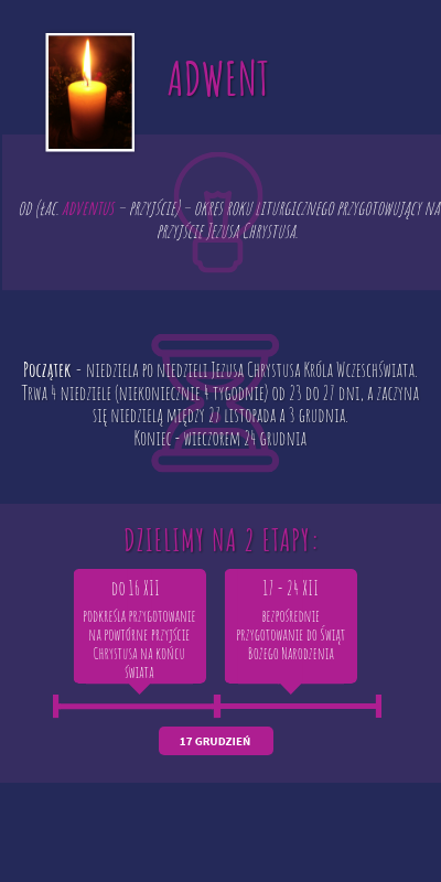 Adwent jest okresem radosnego oczekiwania, choć dominującym kolorem w liturgii jest fiolet. Kolor ten łączymy najczęściej ze skruchą i pokutą. Fiolet symbolizuje jednak także rzeczy nadprzyrodzone, a na nich w sposób szczególny w Adwencie uwaga chrześcijanina powinna być skupiona. To pozornie sprzeczne zestawienie związane jest z podwójnym wymiarem Adwentu. Po pierwsze chrześcijanie wspominają pełne nadziei oczekiwanie narodu Izraelskiego na przyjście Mesjasza, tym samym przygotowując się do Uroczystości Bożego Narodzenia. Drugi wymiar - w istocie ważniejszy - stanowi oczekiwanie na powtórne przyjście Pana na końcu czasów. Jak czekać? Człowiek jest słaby, grzeszny, ale to nie zwalnia go z bycia w ciągłej gotowości. Czas Adwentu zatem to okazja do refleksji, oczyszczenia serca i próba odpowiedzi na pytanie, jak jestem przygotowany do spotkania z Bogiem.