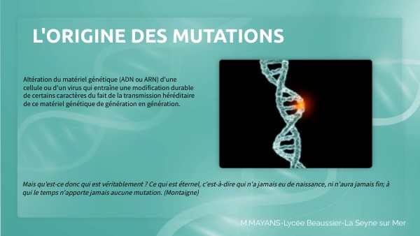 les mutations sont des phénomènes relativement rares, accidentelles et aléatoires, elles interviennent au cours de la réplication de façon spontanée