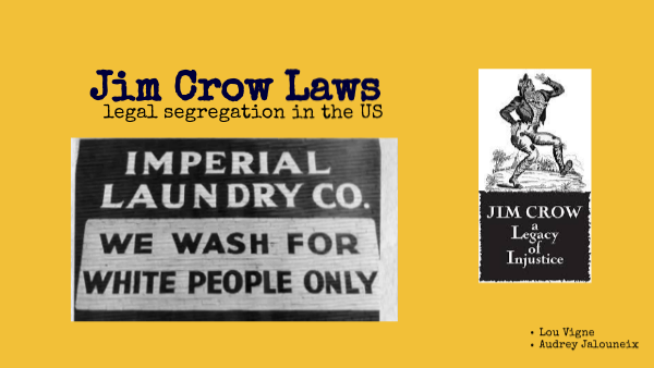 Jim Crow laws were State and local laws that enforced racial segregation against Black people in the U.S.A. They obstruct the american constitutionnal laws and their main principal is "separate but equal". This racial segregation is extended to public facilities and transportation.