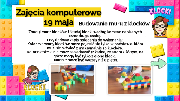 Zbuduj mur z klocków. Układaj klocki według własnego pomysłu lub komend osoby z Tobą pracującej. Przykładowe polecenia do wykonania: Kolor czerwony klocków może pojawić się tylko w podstawie, która musi się składać z maksymalnie 10 klocków. Na górze mogą być tylko zielone klocki. Mur nie może być wyższy niż 8 pięter.