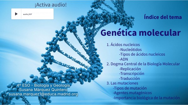 1. Ácidos nucleicos -Nucleótidos -Tipos de ácidos nucleicos -ADN2. Dogma Central de la Biología Molecular-Replicación -Transcripción -Traducción3. Las mutaciones-Tipos de mutación -Agentes mutagénicos -Importancia biológica de la mutación