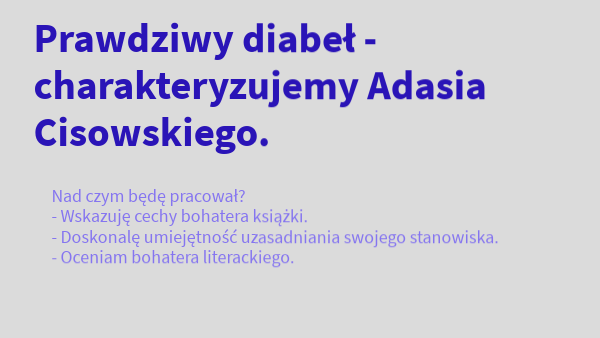 Nad czym będę pracował? - Wskazuję cechy bohatera książki. - Doskonalę umiejętność uzasadniania swojego stanowiska. - Oceniam bohatera literackiego.