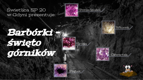 Zadania do wykonania: - Przebieranie w kombinezon, - Jazda winda w dół ( przysiad), - Marsz na stanowiska pracy, - Praca świdrem ( wrrrrrrrrrrr) - Kopanie łopatą ( hej-siup) - Ocieranie potu z czoła: raz prawą, raz lewą ręką, - Rąbanie kilofem( łup, łup) - Jazda wagonikiem ( bieg w kółeczku) - Powrót z pracy.