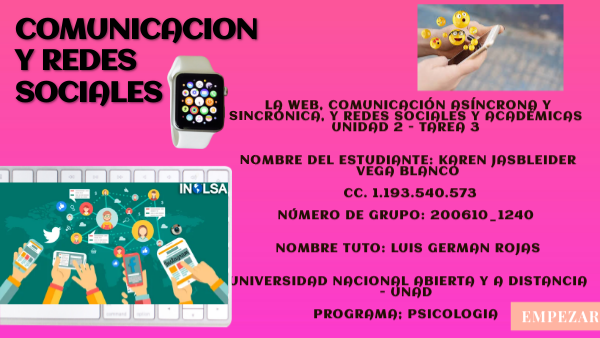 LA WEB, COMUNICACIÓN ASÍNCRONA Y SINCRÓNICA, Y REDES SOCIALES Y ACADÉMICAS UNIDAD 2 - TAREA 3 NOMBRE DEL ESTUDIANTE: Karen Jasbleider VEga blanco CC. 1.193.540.573 NÚMERO DE GRUPO: 200610_1240 NOMBRE TUTO: Luis german rojas UNIVERSIDAD NACIONAL ABIERTA Y A DISTANCIA - UNAD programa; psicologia