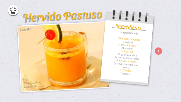 1. Des Clous de Girofle (3 éclats)2. De la Cannelle (1 branche) 3. Des Fruit (80 gr de fruit de la paisson ou autres fruits) 4. De vie de Nariño (½ Coup ou ce que vous veux ) 5. De L’eau (2 tasses)