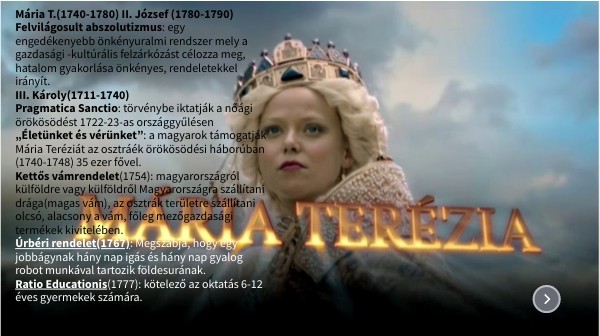 Mária T.(1740-1780) II. József (1780-1790) Felvilágosult abszolutizmus: egy engedékenyebb önkényuralmi rendszer mely a gazdasági -kultúrális felzárkózást célozza meg, hatalom gyakorlása önkényes, rendeletekkel irányít. III. Károly(1711-1740) Pragmatica Sanctio: törvénybe iktatják a nőági örökösödést 1722-23-as országgyűlésen „Életünket és vérünket”: a magyarok támogatják Mária Teréziát az osztráék örökösödési háborúban (1740-1748) 35 ezer fővel. Kettős vámrendelet(1754): magyarországról külföldre vagy külföldről Magyarországra szállítani drága(magas vám), az osztrák területre szállítani olcsó, alacsony a vám, főleg mezőgazdasági termékek kivitelében. Úrbéri rendelet(1767): Megszabja, hogy egy jobbágynak hány nap igás és hány nap gyalog robot munkával tartozik földesurának. Ratio Educationis(1777): kötelező az oktatás 6-12 éves gyermekek számára. „ Türelmi rendelet