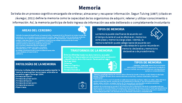 Se trata de un proceso cognitivo encargado de ordenar, almacenar y recuperar información. Segun Tulving (1987) (citado en Jáuregui, 2011) define la memoria como la capacidad de los organismos de adquirir, retener y utilizar conocimiento o información. Así, la memoria participa de todo ingreso de información sea este deliberado o completamente involuntario