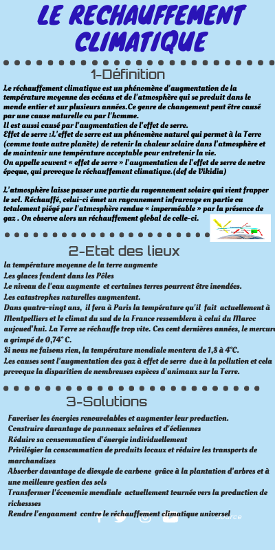 Le réchauffement climatique est un phénomène d'augmentation de la température moyenne des océans et de l'atmosphère qui se produit dans le monde entier et sur plusieurs années.Ce genre de changement peut être causé par une cause naturelle ou par l'homme. Il est aussi causé par l'augmentation de l'effet de serre. Effet de serre :L'effet de serre est un phénomène naturel qui permet à la Terre (comme toute autre planète) de retenir la chaleur solaire dans l'atmosphère et de maintenir une température acceptable pour entretenir la vie. On appelle souvent « effet de serre » l'augmentation de l'effet de serre de notre époque, qui provoque le réchauffement climatique.(def de Vikidia) L'atmosphère laisse passer une partie du rayonnement solaire qui vient frapper le sol. Réchauffé, celui-ci émet un rayonnement infrarouge en partie ou totalement piégé par l'atmosphère rendue « imperméable » par la présence de gaz . On observe alors un réchauffement global de celle-ci.