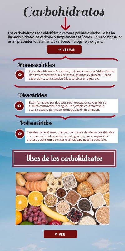 Los carbohidratos más simples, se llaman monosacáridos. Dentro de estos encontramos a la fructosa, galactosa y glucosa. Tienen sabor dulce, consistencia sólida, solubles en agua, etc.