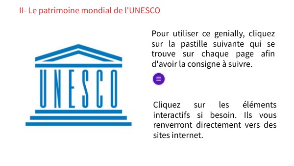 Pour utiliser ce genially, cliquez sur la pastille suivante qui se trouve sur chaque page afin d'avoir la consigne à suivre.