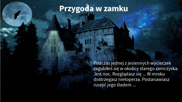 Podczas jednej z jesiennych wycieczek zagubiłeś się w okolicy starego zamczyska. Jest noc. Rozglądasz się ... W mroku dostrzegasz nietoperza. Postanawiasz ruszyć jego śladem ...