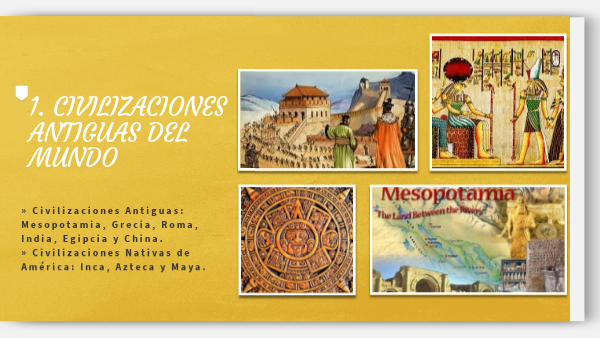 » Civilizaciones Antiguas: Mesopotamia, Grecia, Roma, India, Egipcia y China. » Civilizaciones Nativas de América: Inca, Azteca y Maya.
