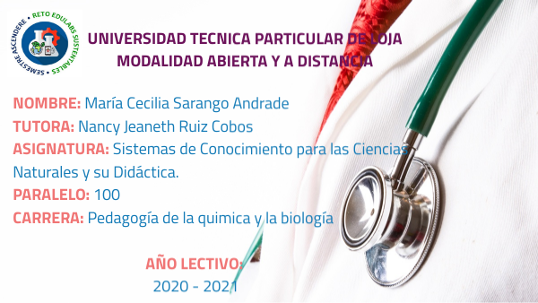 NOMBRE: María Cecilia Sarango Andrade TUTORA: Nancy Jeaneth Ruiz Cobos ASIGNATURA: Sistemas de Conocimiento para las Ciencias Naturales y su Didáctica. PARALELO: 100 CARRERA: Pedagogía de la quimica y la biología AÑO LECTIVO: 2020 - 2021