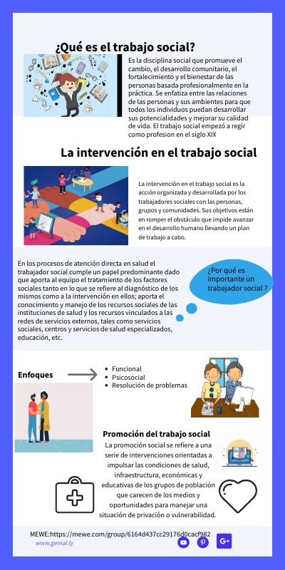 Es la disciplina social que promueve el cambio, el desarrollo comunitario, el fortalecimiento y el bienestar de las personas basada profesionalmente en la práctica. Se enfatiza entre las relaciones de las personas y sus ambientes para que todos los individuos puedan desarrollar sus potencialidades y mejorar su calidad de vida. El trabajo social empezó a regir como profesion en el siglo XIX