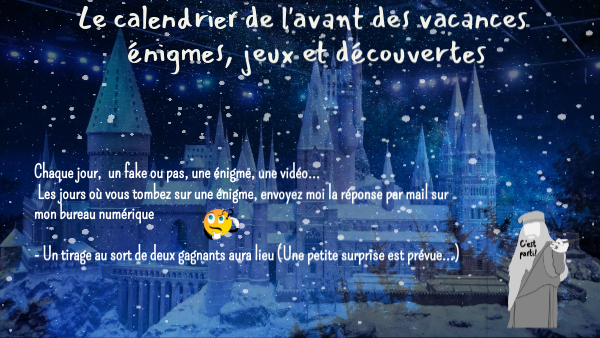 Chaque jour, un fake ou pas, une énigme, une vidéo... Les jours où vous tombez sur une énigme, envoyez moi la réponse par mail sur mon bureau numérique - Un tirage au sort de deux gagnants aura lieu (Une petite surprise est prévue...)