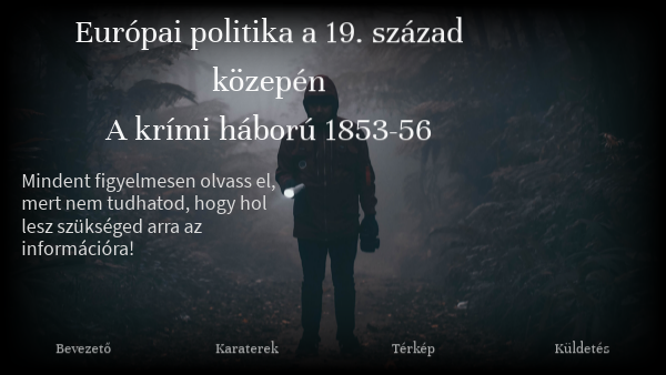 A 19. század közepén még néhány klasszikus európai nagyhatalom irányítja a nemzetközi politikát. Anglia elsősorban a kontinentális egyensúly megőrzésén munkálkodik, Franciaország szeretné visszahozni a napóleoni idők dicsfényét, Oroszország legnagyobb riválisa a Fekete-tengeren az Oszmán Birodalom. A Habsburgok próbálják visszanyerni tekintélyüket és erejüket a magyar szabadságharc leverése után.Az eseményeket minden állam próbálja a saját érdeke mentén irányítani, így elkerülhetetlenné válik az összeütközés. Ahhoz, hogy győzelemmel kerülj ki a konfliktusokból, végig kell játszanod a kor meghatározó államainak vezetői szerepét. A feladatokhoz tartozó ismertetőket mindig figyelmesen olvasd el, mert csak akkor fogsz tudni továbblépni! Sok sikert!