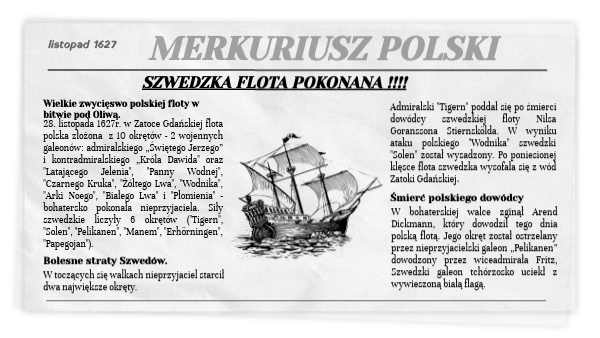 28. listopada 1627r. w Zatoce Gdańskiej flota polska złożona z 10 okrętów - 2 wojennych galeonów: admiralskiego „Świętego Jerzego” i kontradmiralskiego „Króla Dawida" oraz "Latającego Jelenia", "Panny Wodnej", "Czarnego Kruka", "Żółtego Lwa", "Wodnika", "Arki Noego", "Białego Lwa" i "Płomienia" - bohatersko pokonała nieprzyjaciela. Siły szwedzkie liczyły 6 okrętów ("Tigern", "Solen", "Pelikanen", "Manem", "Erhörningen", "Papegojan").