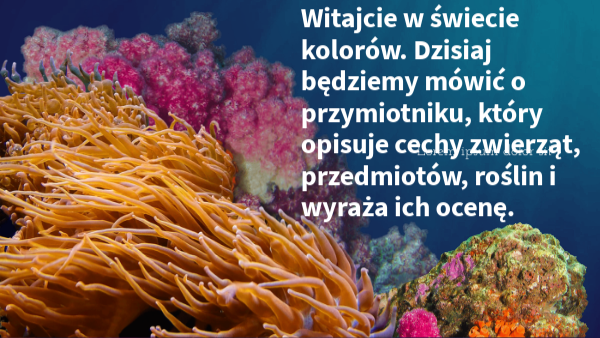 Witajcie w świecie kolorów. Dzisiaj będziemy mówić o przymiotniku, który opisuje cechy zwierząt, przedmiotów, roślin i wyraża ich ocenę.